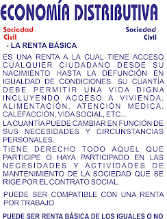 La renta básica es un derecho que se adquiere al nacimiento y se pierde al fallecer. Es el instrumento que permite la distribución de forma igualitaria de la riqueza. La suma de todas las rentas básicas coincide con el valor de las mercancías y servicios disponible en el mercado, lo que se produce es para ser consumido, sino se consume, se deja de producir.